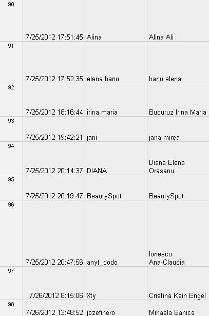 Am revenit cu listele + castigatorul rochitei oferite de catre FashionQueen.ro. Au fost destule persoane care nu au respectat toate cerintele, cum am precizat trebuia completata si casuta de sugestii pentru a fi valida inscrierea. Nu cred ca era greu 1 minut pentru a scrie ceva asa ca mai jos sunt persoanele care au respectat toate cerintele, si anume 120 de inscrieri valide.